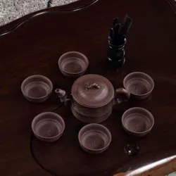 紫砂茶具是用江苏宜兴南部及其毗邻的浙江长兴北部埋藏的一种特殊陶土,即紫金泥烧制而成的。这种陶土,含铁量大,有良好的可塑性,烧制温度以摄氏1150度左右为宜。紫砂茶具的色泽,可利用紫泥泽和质地的差别,经过"澄"、"洗",使之出现不同的色彩,如可使天青泥呈暗肝色,蜜泥呈淡赭石色,石黄泥呈朱砂色,梨皮泥呈冻梨色等;另外,还可通过不同质地紫泥的调配,使之呈现古铜、淡墨等色。优质的原料,天然的色泽,为烧制优良紫砂茶具奠定了物质基础。
